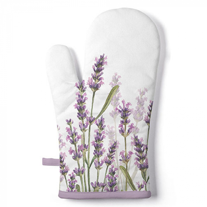 Ovenwant met een frisse lavendelprint. – Materiaal Buitenstof: 100% katoen – Vulling: 100% polyester – Voering: 100% polypropyleen – Formaat 18×30 cm