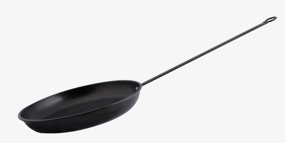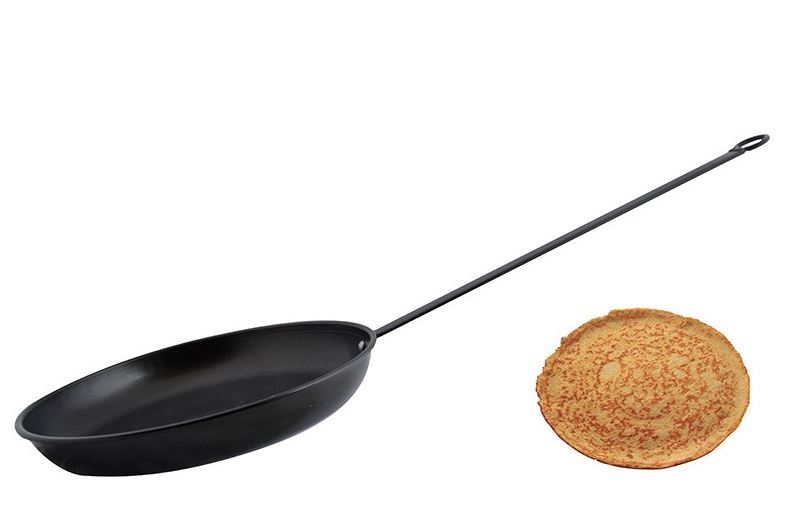 Pannenkoekpan met extra lange steel. Bak veilig pannenkoeken (of iets anders) boven een knappend kampvuur. Pannenkoeken smaken nooit beter!