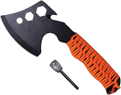 ParaHatchet FS™. 5mm dik blad, zwart oxide gefinished. Behalve hakken kunt u er mee: touw snijden met touw snijder op de rug van het bijltje, boutjes en moertjes aan/los draaien, vuur maken met meegeleverd vuurstaal.