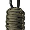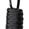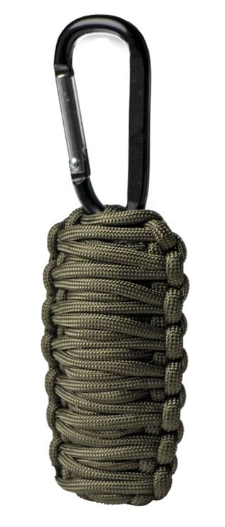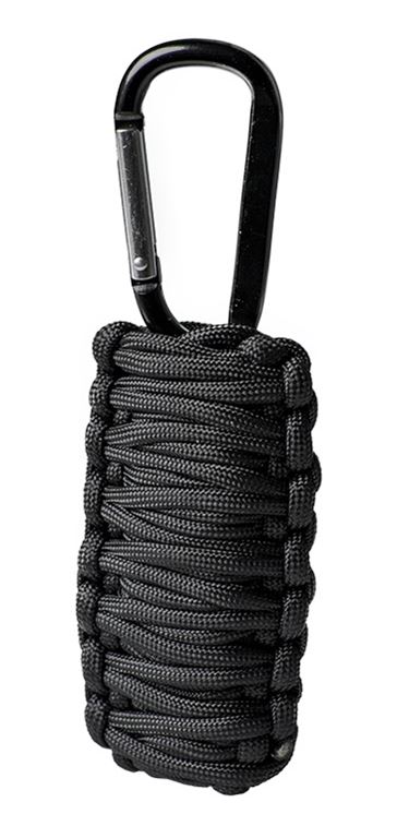 Survival kit. Veilig in drie meter paracord gewikkeld. Met de meegeleverde karabijnhaak aan je riem, rugzak, enz. te haken.