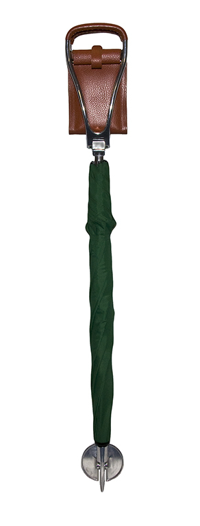 De beroemde Umbrella Seatstick van Gamebird uit Engeland. Of het nu regent of dat je gewoon even wil uitrusten, met een paraplu-zitstok ben je op alles voorbereid.