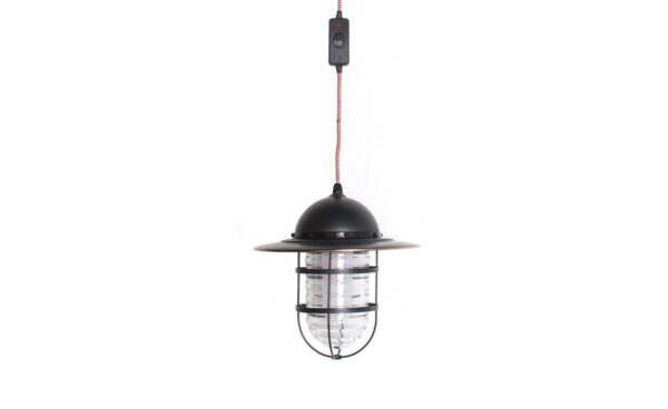 Barebones Pendant. LED hanglamp in retro stijl. Metalen huis, geen plastic. Met versterkt ophangsnoer met in hoogte verstelbare karabijnhaak. U kunt eventueel 2 of 3 Pendant lampen electrisch met elkaar verbinden. Bevat geen batterijen, werkt op 12V van een accu, of via de adapter op het lichtnet.