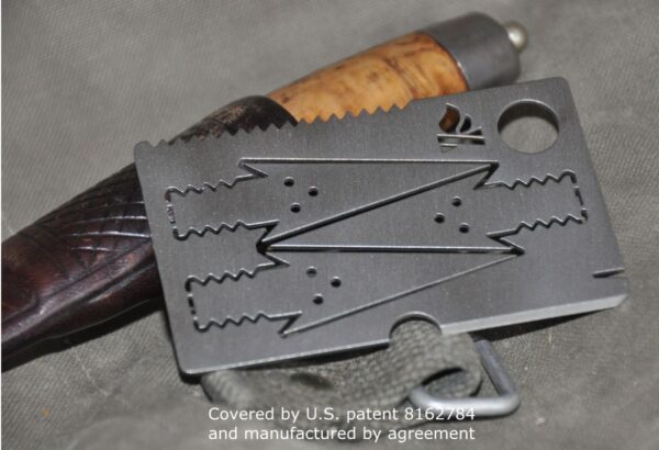 RVS plaat met zaag en uitstansbare pijlpunt. Een andere rand kan indien nodig scherp geslepen worden. Ook geschikt voor mensen met huidallergie. Let op: scherpe rand. Doe er een silencer om om huid en kleding te beschermen. Halsketting indien gewenst apart bestellen.