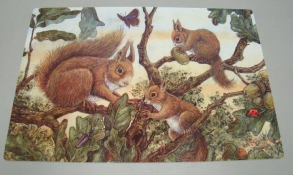 Flexibele placemat eekhoorn familie. Nat afneembaar Afmeting: 43 x 29 cm.
