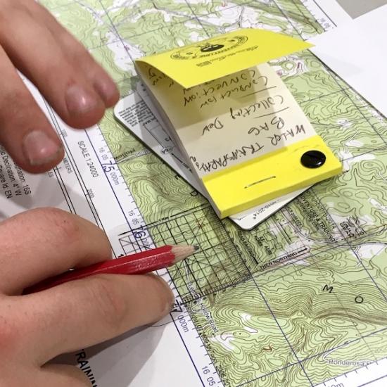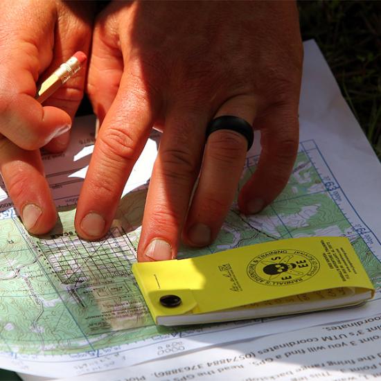Inclusief micronotebook met watervast papier, drie plastic instructiekaarten en vier transparante overlaykaarten om kaartcoördinaten, azimuts en afstanden te bepalen.