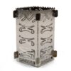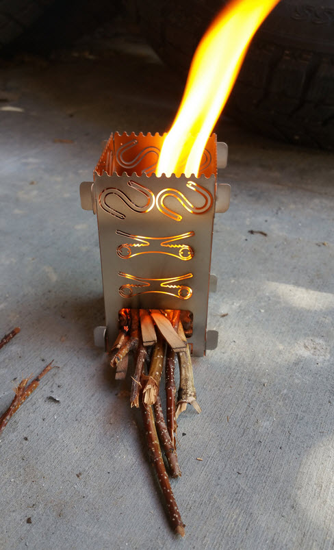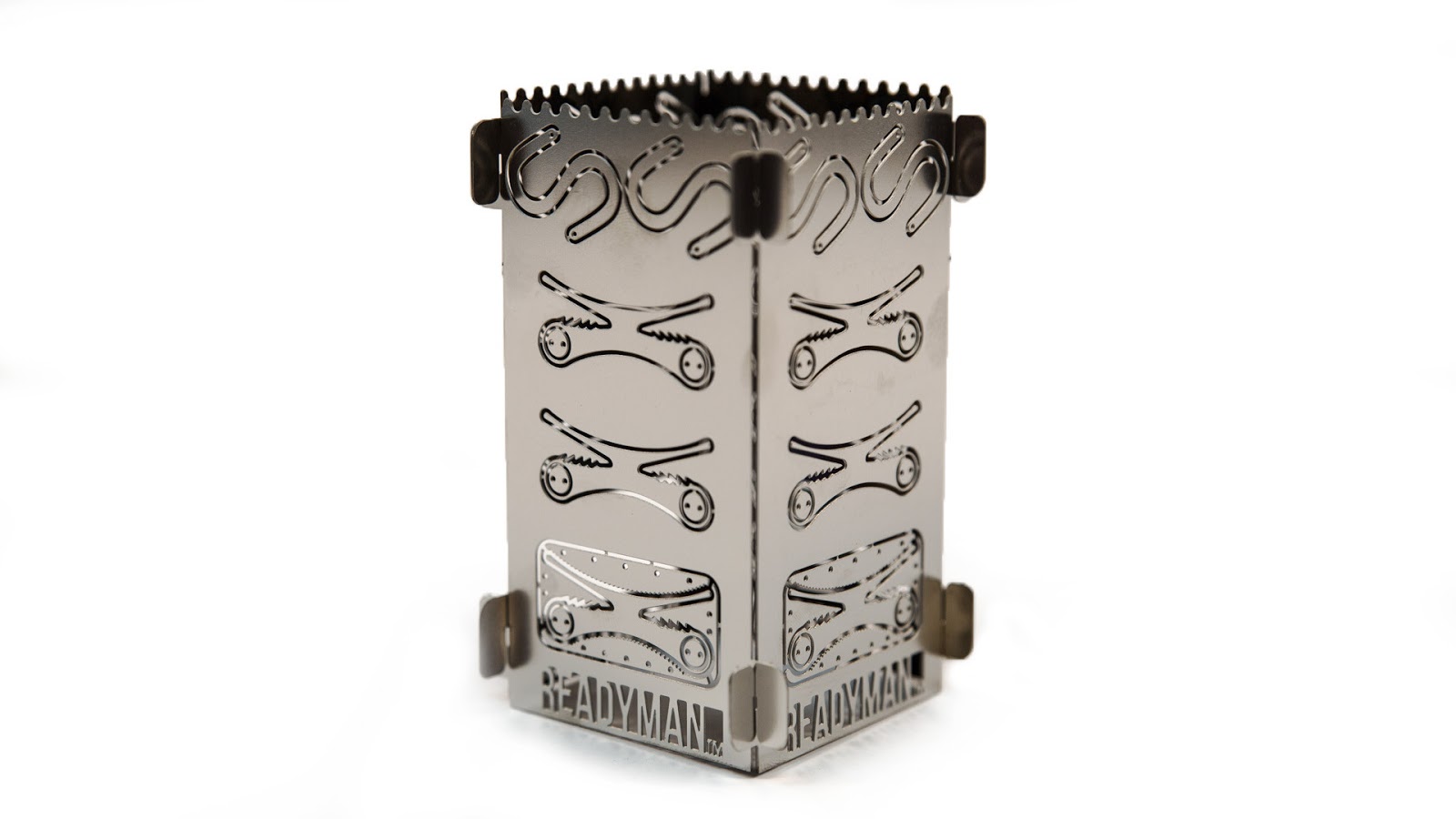 Readyman Pocket Survival Stove 2.0. Klein en licht genoeg houtbrandertje zodat hij zonder problemen in een jaszak of dijbeenzak meegenomen kan worden. Inclusief bestek. Uit elk van de vier wanden kunnen survival items gedrukt worden, zoals vishaakjes, een pijlpunt, zaagje, enz.