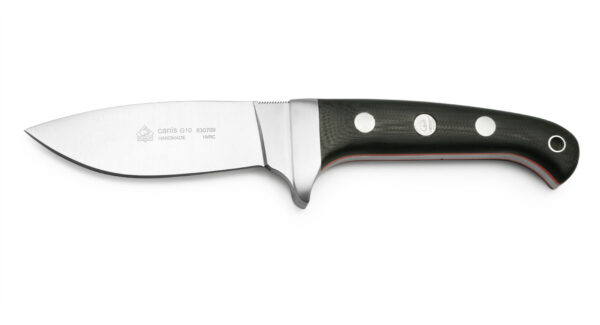 Klein maar fijn, maar toch robuust en betrouwbaar, zo presenteert het vaste mes CANIS G10 uit de IP-serie van Puma zich. Voor het droppoint-lemmet met full tang wordt roestvrij Böhler N695 high-performance staal gebruikt. Dankzij de duimsteun en de beschermkap van roestvrij staal kan het lemmet netjes en veilig worden geleid.