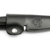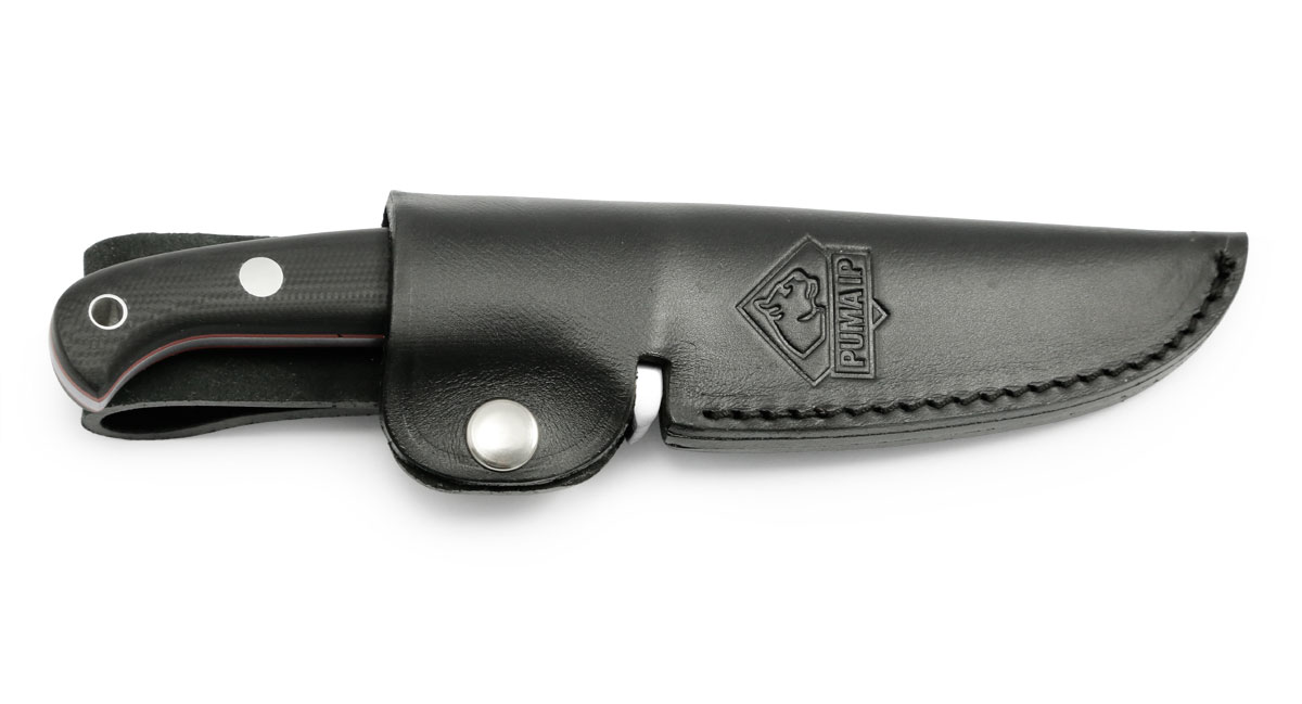 Het heft, ontworpen voor kleine tot middelgrote handen, met handgrpen van zwart G10 op een rood glasvezelpad, ligt prettig in de hand. Een keurig aansluitende riemfoedraal van zwart leer is bij de levering inbegrepen.