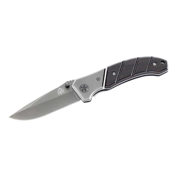 Zo ziet een robuust eenhandsmes (met 1 hand te openen) eruit! Het Puma TEC-model heeft een vergrendelbaar lemmet van roestvrij staal 420, houten handgreepschalen en krop van roestvrij staal. De riemclip heeft, net als het lemmet en de krop, een titanium afwerking.
