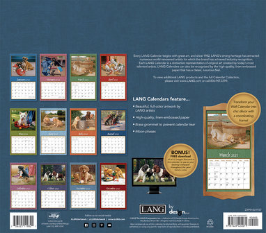 Amerikaanse Lang kalender. LANG-wandkalenders hebben maandelijkse full colour afbeeldingen, elegant linnen reliëfpapier en een koperen oogje om op te hangen.