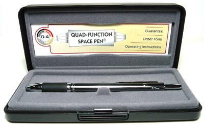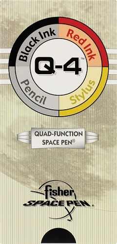 Fisher Quad Function Space Pen. This Fisher 4-in-1 Space Pen has a gunmetal / chrome colour. The Fisher Quad Function Pen uses black Fisher Space Pen ink, red Fisher Space Pen ink, plastic stylus point (for use on your PDA!) and a .7mm mechanical pencil.