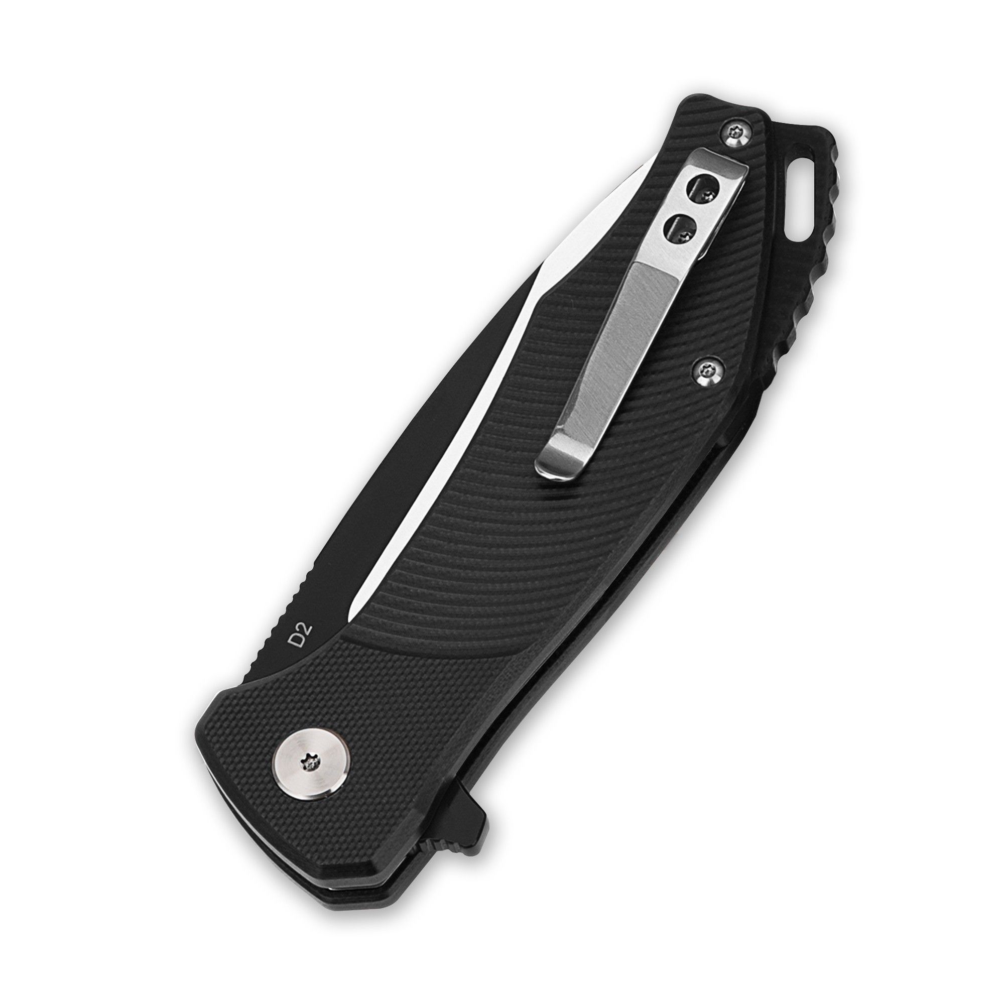De greep is gemaakt van zwart G10 dat zorgt dat het mes comfortabel en veilig in de hand ligt. Op de achterzijde van het handvat zit een omkeerbare clip, en een koordoog op de bovenzijde van het handvat.
