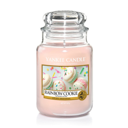 Yankee Candle grote geurkaars pot Rainbow Cookie. Lichte en luchtige koekjes met citrus- en perzikvulling en zoete vanilleglazuur