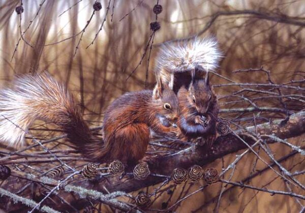 Wat ontvangt u liever, een appje ‘beterschap’, of een mooie wenskaart met een paar welgemeende handgeschreven woorden? Wenskaart “Red Squirrels” Van een schilderij door Phillip Allder Afmeting: 20 x 14 cm Inclusief envelop