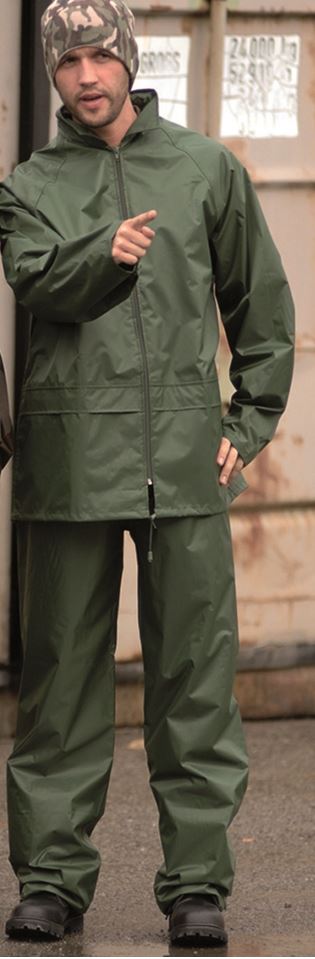 Regenpak. Ideaal regenpak voor incidenteel gebruik. Gemaakt van waterwerend ademend 3-lagen nylon. Het jack heeft een 2-weg rits, 4 zakken en een capuchon. De broek heeft eveneens 4 zakken en ritsen onderaan voor gemakkelijk aan/uittrekken.