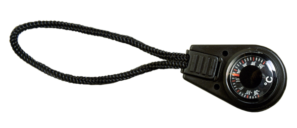 Ritstrekker met thermometer. Je kunt een rits gemakkelijker openen en sluiten, zeker met handschoenen aan, en je kunt gelijk zien hoe warm of koud het wel niet is. – Gewicht 6.5 gram – Display Ø 2 cm
