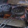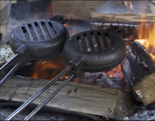 Wilderness Hamburger Griller – Gietijzer. Een geweldige manier om hamburgers en kip te koken boven een kampvuur zonder de complicaties en het gedoe van het gebruik van grote grillroosters. Het enige wat je hoeft te doen is de gietijzeren holte vullen met vlees, het deksel sluiten, het scharnier vergrendelen en boven een brandend vuur houden. De gleuf simuleert het koken van grillroosters en zorgt ervoor dat overtollig vet van het vlees weg druipt.
