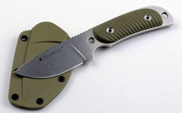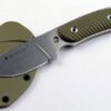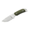 The compact design of the Hunter 165 permits use as a large neck knife as well as carrying on the belt with the included belt adapter for the kydex sheath. The bellied blade is particularly suited for hunting purposes as a compact skinner. Green G10 scales and green kydex sheath. Stonewash finish blade.