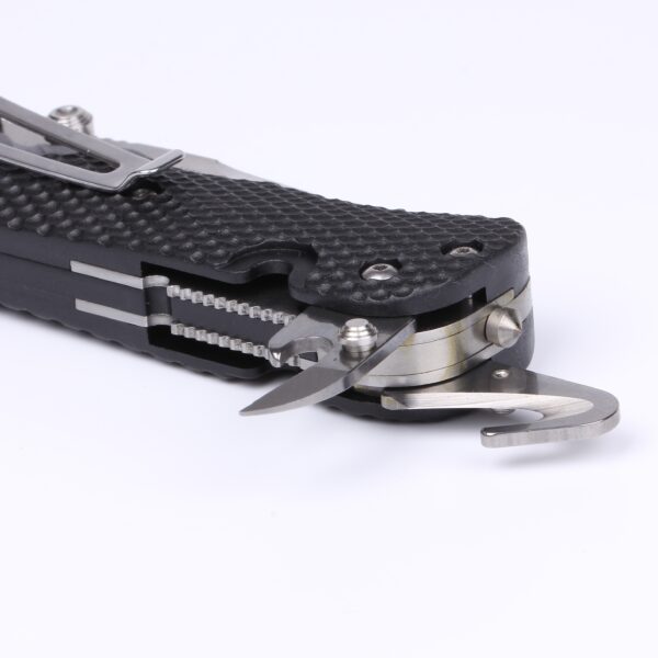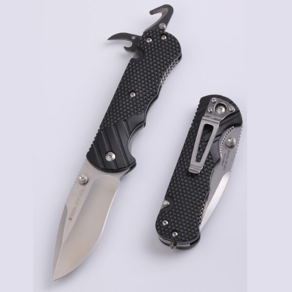 The M21 rescue knife only weights 160g but feels naturally stable in your hand. Thanks to the two big thumb studs the user can open the knife easily and effortlessly – even with gloves. The 89mm large drop point blade has good cutting properties and is also easy to maintain. The blade is made from Chinese 8Cr14MoV steel. This steel is now commonly used by many brands, but the different manufactures also deliver different quality results. Thanks to our excellent experience in the heat treatment of steel 8Cr series, the M21 features high sharpness and also holds its sharpness for a long time. As a handle material for the M21, we decided to use FRN. The handles are shaped so that large hands can also find generous space. Among the roughened shells are steel plates. Belt cutter and glass breaker should not be missed in this rescue knife. However, the M21 is not designed for extremely rough and heavy work, our goal is to build the most suitable knife for 90% of all services. Anyone who appreciates quality and reliability will love the M21.