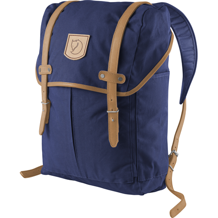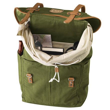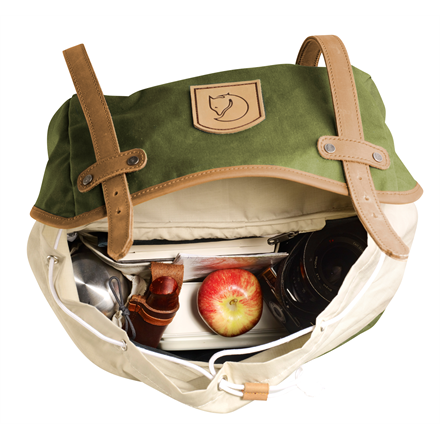 Large backpack in classic Fjällräven style, made from a more durable version of our waxed G-1000. Perfect for both everyday use in town or time spent in the forest. The clean lines and functional details in natural tone leather mean that it meets all of the requirements to become a favourite for many years to come. The main compartment is loaded from the top, comes equipped with a snow lock and has an inner pocket with a padded bottom to hold a laptop. It also has a removable seat pad and a pocket that holds a thermos in an upright position, and the light-coloured lining makes it easier to see the contents. The top lid is held in place by straps that attach to metal nubs on the front. One large front pocket and side pockets.