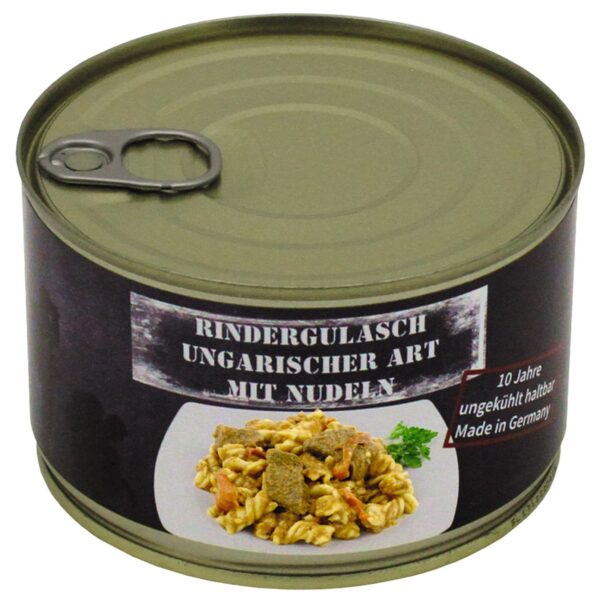 Hongaarse rundergoulash met noedels (pasta). In Duitsland handgemaakt van lokale ingrediënten.