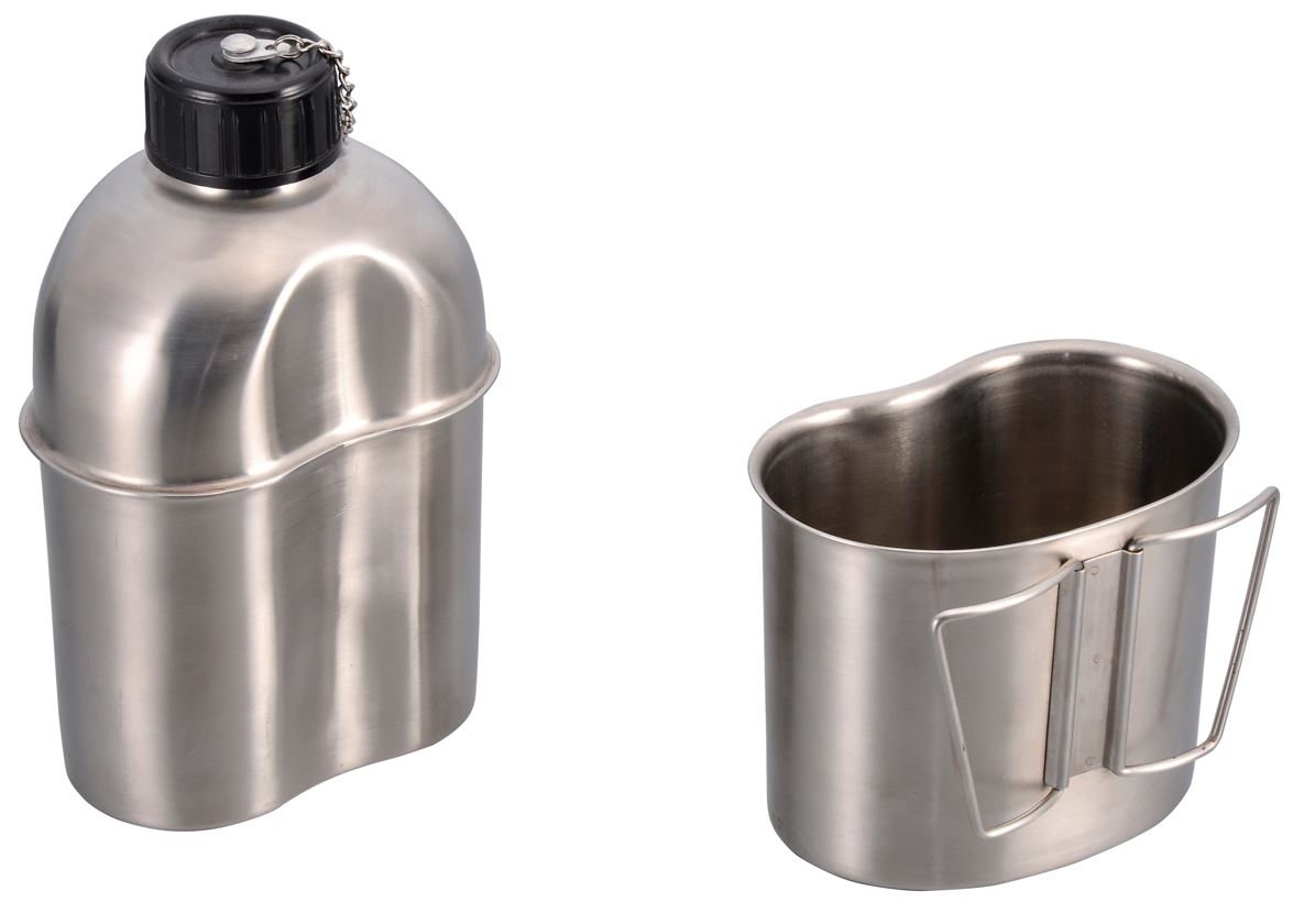 Lichte, stijlvolle en robuuste veldfles van hoogwaardig RVS met grote drinkbeker. Dankzij het grote volume is de mok ook ideaal voor het bereiden van trekkingvoedsel en maaltijden. De fles en beker kunnen in elkaar worden gestapeld en dankzij de inklapbare handgrepen aan de beker kunnen ze ruimtebesparend worden opgeborgen in de meegeleverde transporttas.