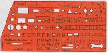 Schabloon met NATO tactische symbolen voor verzorgd kaartenwerk. Afmeting: 90 x 190 mm. Dikte 1 mm. Gemaakt van doorzichtig oranje plastic.
