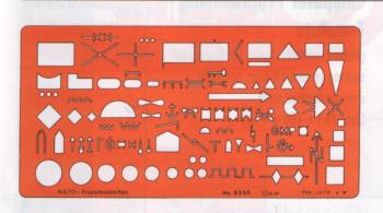 Schabloon met NATO tactische symbolen voor verzorgd kaartenwerk. Afmeting: 90 x 190 mm. Dikte 1 mm. Gemaakt van doorzichtig oranje plastic.
