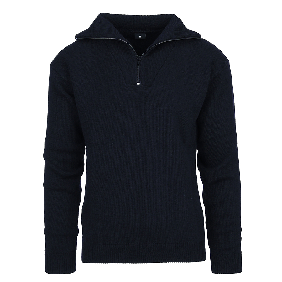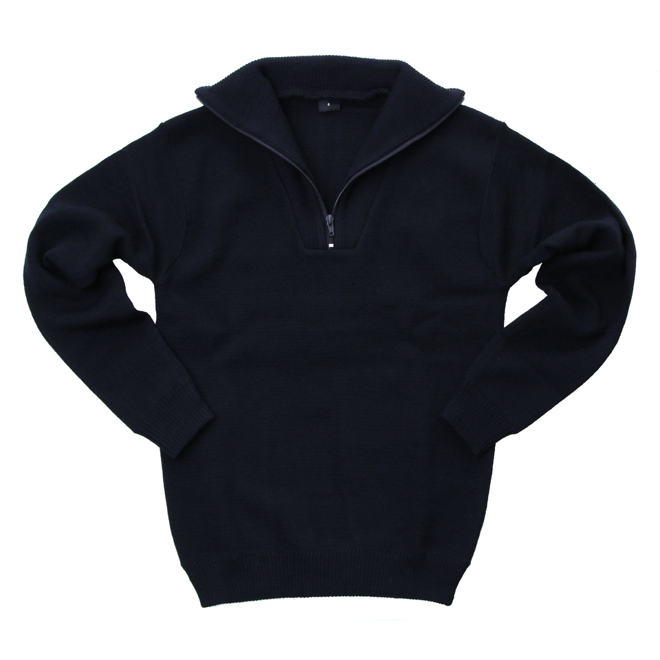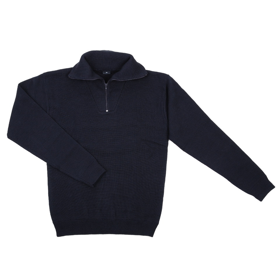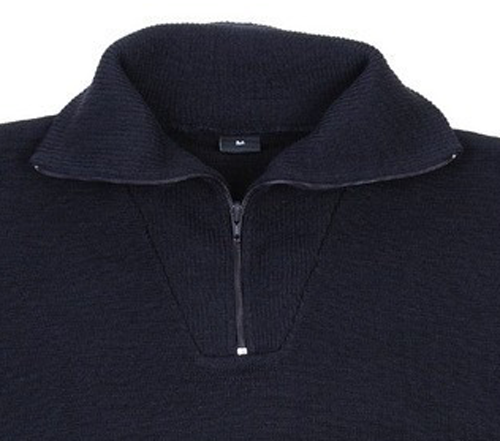 Traditionele schipperstrui met rits die doorloopt tot in de kraag. Daardoor kan van de kraag een col gemaakt worden.