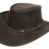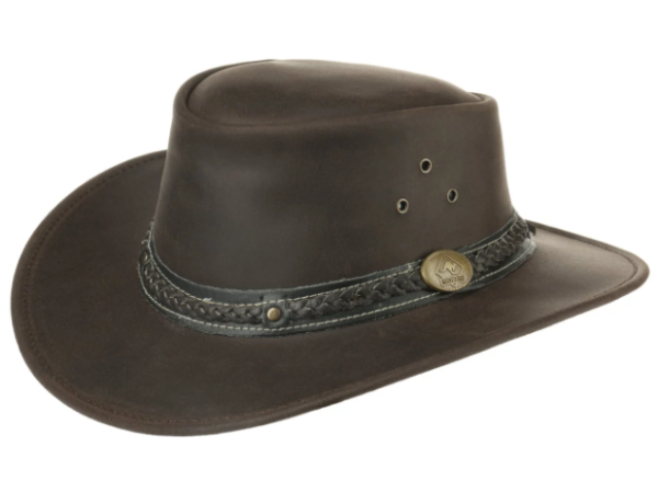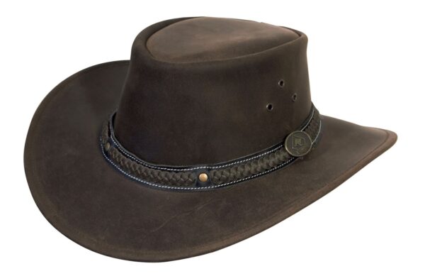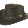 Scippis leren hoed ‘Wilsons’. Originele Australische leren hoed in een nieuw, iets platter design. Bijzonder mooi: het gevlochten lint met het Scippis-embleem.