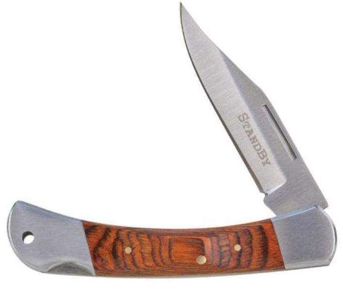 Zakmes “Standby” met een lengte van 22 cm. Roestvrij stalen Droppoint lemmet en ‘pakka wood’ schalen met een RVS beweegbaar koordoog/sluiting.