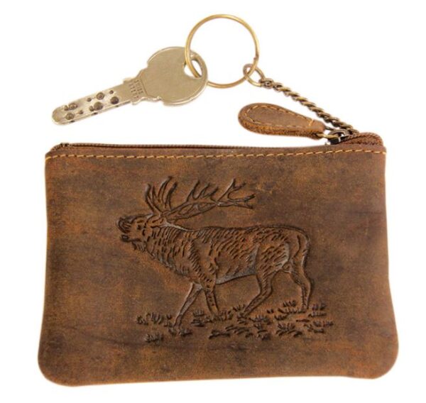 Sleuteletui van buffelleer met hertenprint. Het perfecte cadeau voor elke jager en wildliefhebber! Gemaakt van hoogwaardig, ecologisch gelooid buffelleer met pull-up effect en heeft een ritssluiting, een muntvakje en een stevige sleutelhanger.