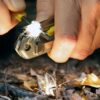 N.B. Wie de video bekijkt ziet dat de reviewer vonken van zijn vuurstaal schraapt met de scherpe kant van zijn lemmet. DOE DIT NIET! Gebruik de bovenkant van het lemmet.