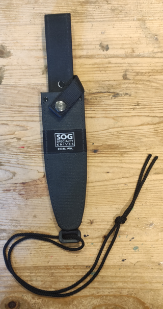Nylon messchede met harde inleg van SOG Knives. Past aan koppels tot bijna acht cm breed. Met dijbeenkoord Voor messen met een lemmet van plm. 17cm lang en 2,7 cm breed.