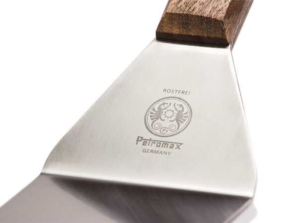 Petromax spatel, kort. In de pan of op de grill: vlees, vis en groenten keert u gemakkelijk om met de Petromax spatel. Met zijn walnoten steel is de petromax fijn vast te houden, terwijl het blad van geborsteld roestvrij staal met zijn uitgekiende vorm zonder ze te beschadigen te gebruiken is met pannen en roosters. Voorzien van een oog om hem aan op te kunnen hangen. Deze spatel voelt zich net zo thuis in de keuken als op de BBQ.