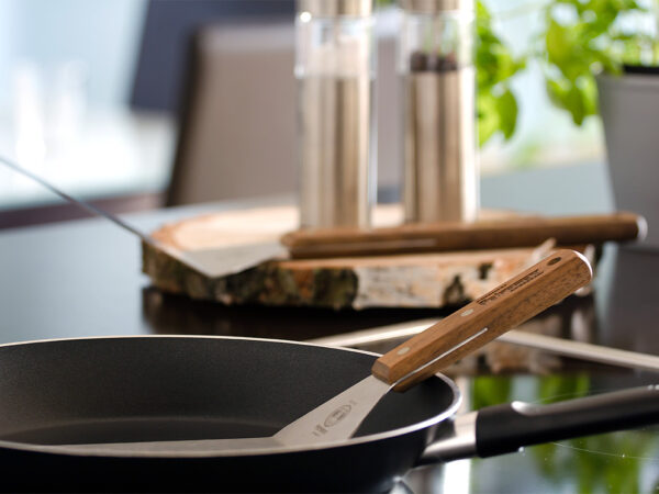 To allow having the cooking well in hand, the stainless steel blade tapers at its end. This way it stays supple and flexible, so that it is possible to turn over food of every size. Nevertheless the spatula is steady and sturdy enough for scraping meat juices from the bottom of the pan or pot. The spatula is also particularly suitable for Petromax griddles. As the handle’s end is provided with a hole, the spatula can be conveniently hung and put away.