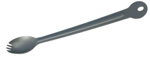 Titanium extra lange spork. Extra lang en licht universeel bestek met vork, lepel ineen, en met een praktisch bevestigingsoog. Uitermate geschikt voor het eten uit zakken gevriesdroogd voedsel, MRE’s en voedselcontainers.