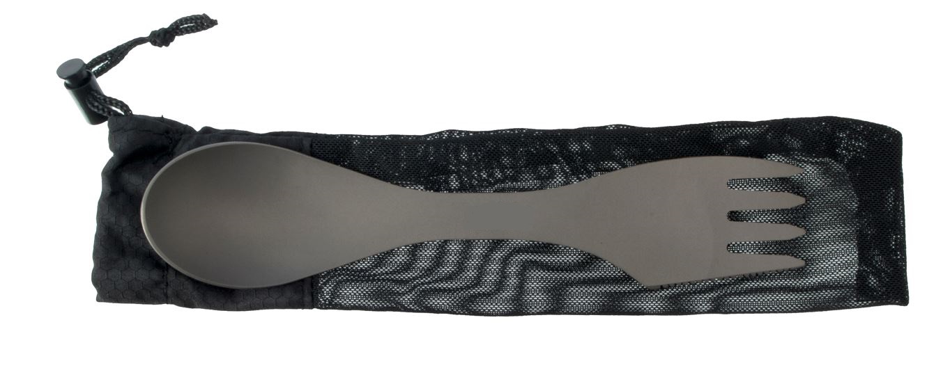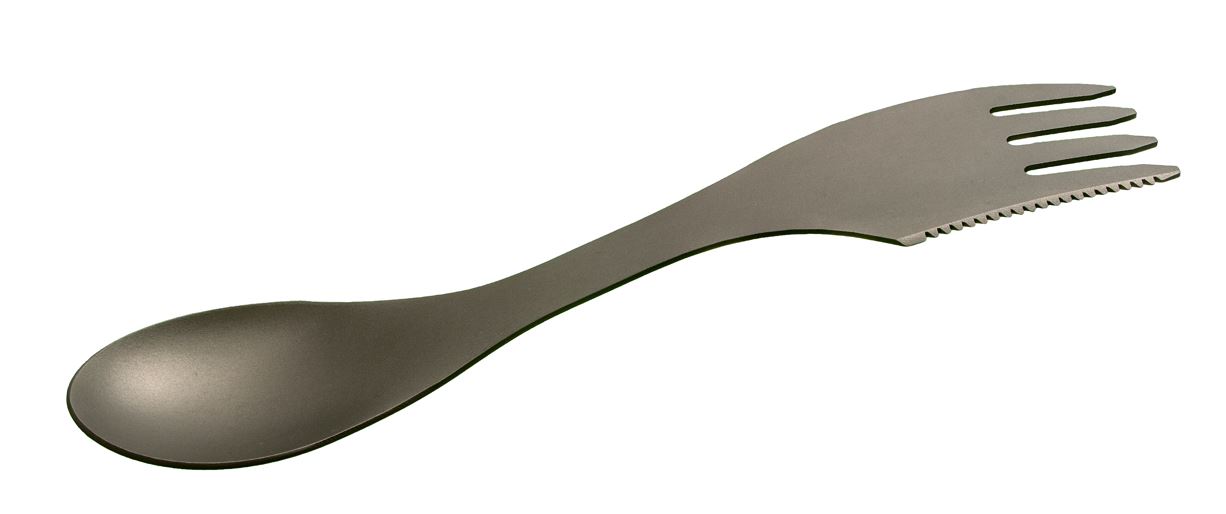 Titanium spork. Extra licht universeel bestek met vork, lepel en gekartelde mesrand ineen. Het langere snijvlak zorgt voor een beter snijden van je etenswaren.