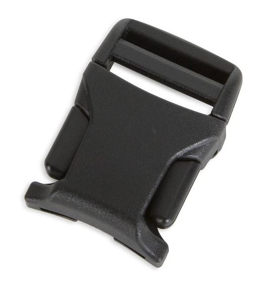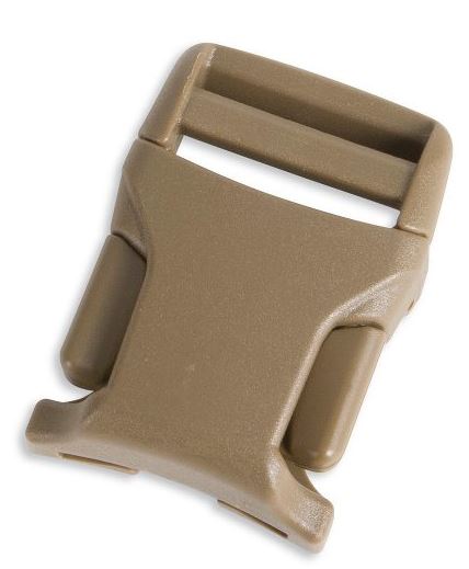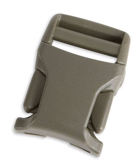 Snelgesp waarvan het ene gedeelte horizontaal of verticaal aan de PALS van een MOLLE systeem bevestigd kan worden, en waar in het andere gedeelte een 25mm band of riem gestoken kan worden.