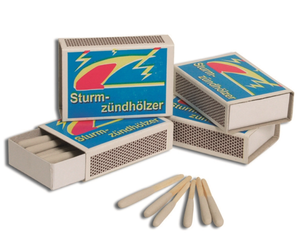 Storm Matches. Lucifersdoosje met 20 windvaste lucifers. Bestand tegen onderdompeling in water. Niet binnen gebruiken.