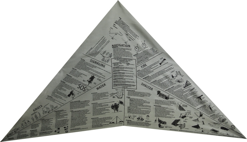 Driehoekige Bandana / halsdoek. Gemaakt van 100% grijs polyester met gedrukte zwarte overlevingsinformatie, waaronder: navigatie, vuur maken, onderdak, wateropvang en -zuivering, signalering, een handige knopensectie en een sectie voor prioriteiten.