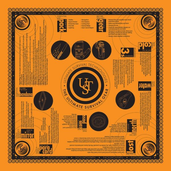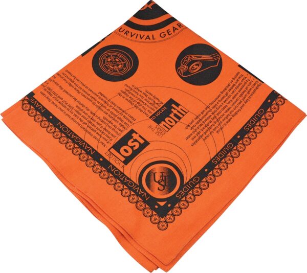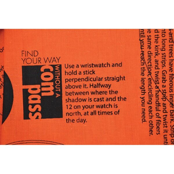 100% bright orange polyester construction with printed black survival information including: Navigation, Fire Starting, Shelter, Water Collection & Purification, Signaling, a useful Knots section, and a section for Priorities considerations.