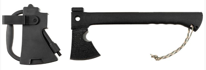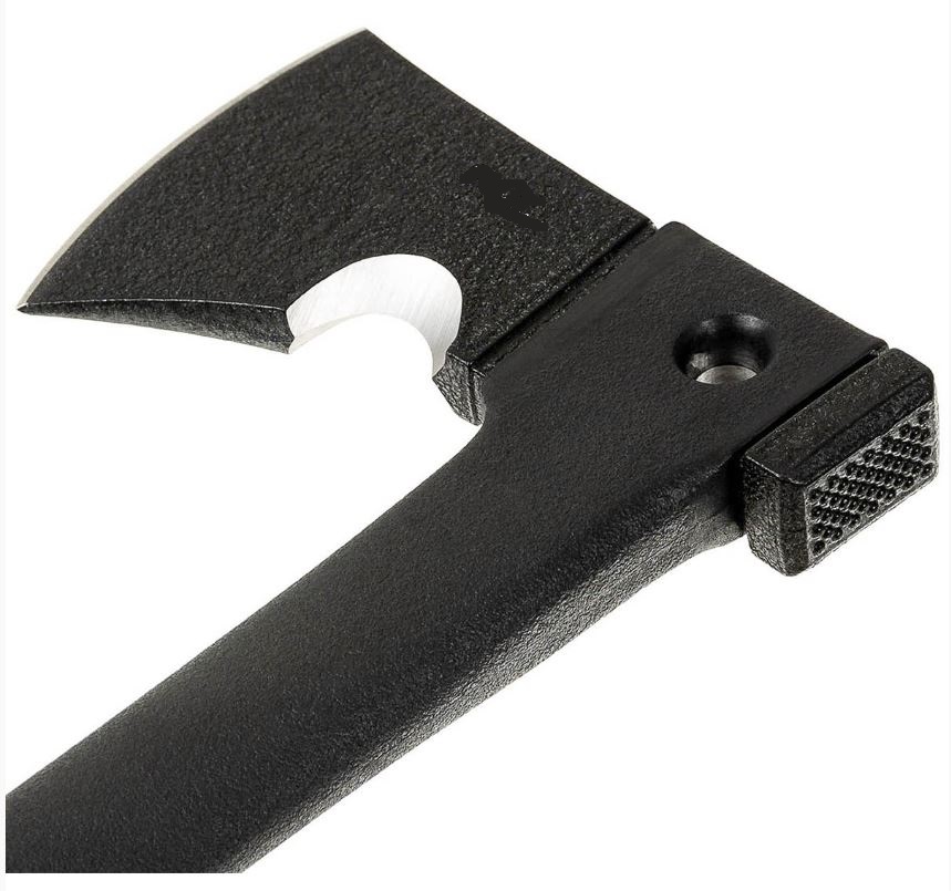 Survivalbijl met kunststof steel. Gezwart lemmet van 3Cr13-staal met gladde slijping.