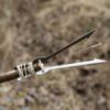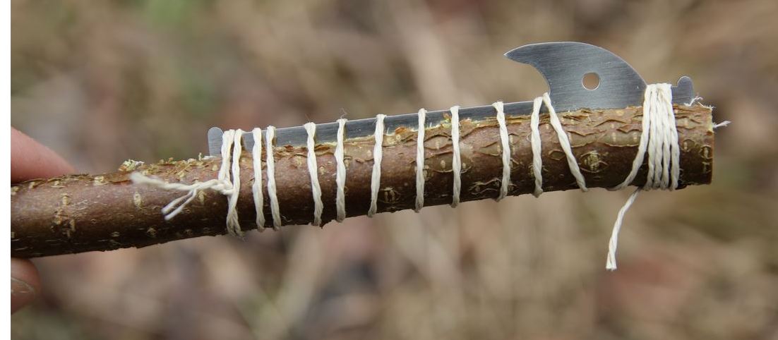 Zaag drie groeven rond de speer, boor een gat ter plaatse van de borgpen, breek de spikes uit en steek ze in de groeven. Maak vervolgens de spiesjes vast en rijg het koord door de veiligheidsgaten.