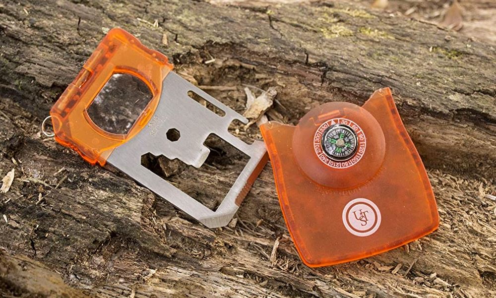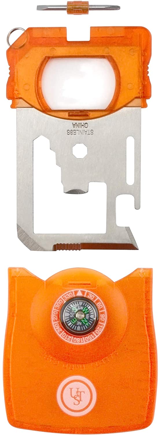 UST Survival Card Tool met duurzame, compacte roestvrijstalen constructie, blik- en flesopener en schroevendraaier voor wandelen, kamperen en outdoor survival.