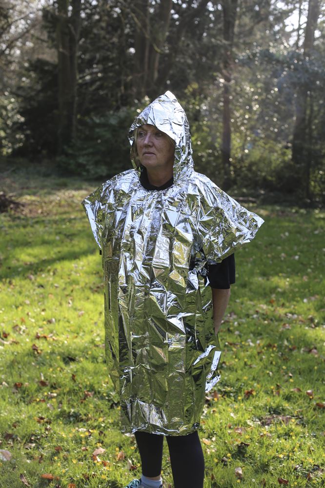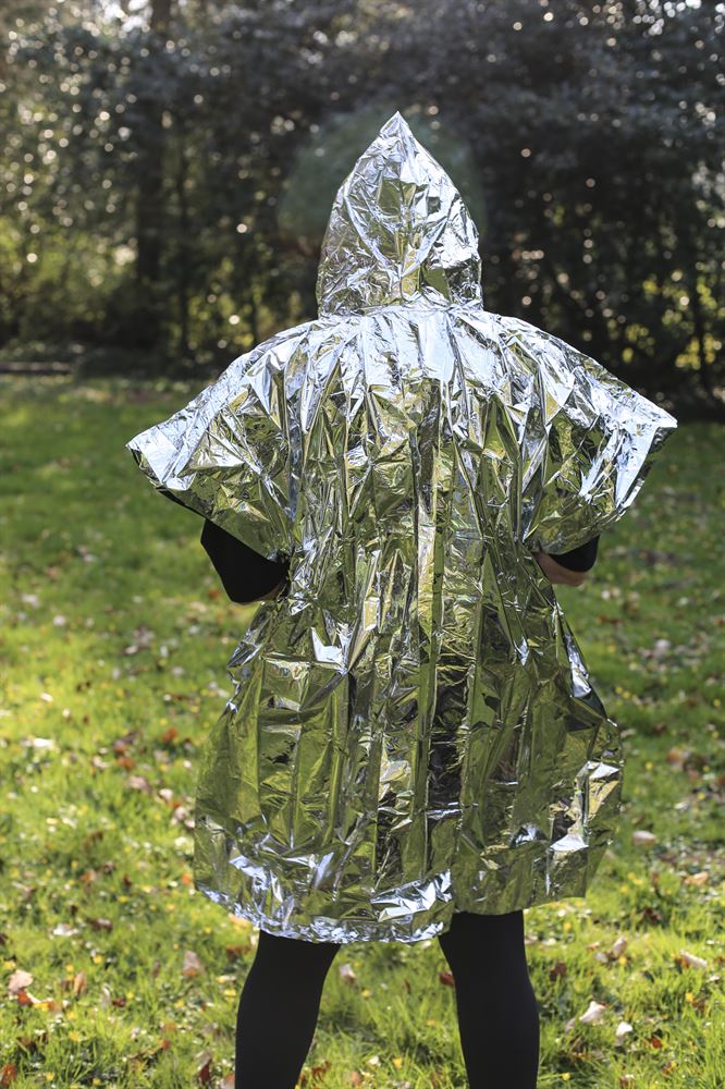 Survival Poncho. Een spaceblanket reddingsdeken in de vorm van een poncho.