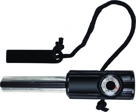 The Survivor Firestarter is the perfect tool for your emergency kit as this device will allow you to start a fire in any weather conditions. the Survivor Firestarter has a built in compass on the bottom of the handle and a temperature gauge on the side of the handle. This device ships in clamshell packaging and includes an instruction card.