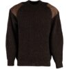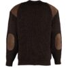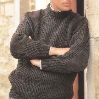 Warme trui van waterafstotende wol. Lederen schouder- en elleboogstukken. Ronde hals.
