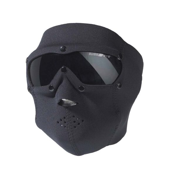 Professioneel neopreen gezichtsmasker. 2mm dicht neopreen, aan de binnenkant opgeruwd voor groter draagcomfort, en met glazen van dubbel glas als een soort thermopeen. Deze glazen isoleren niet alleen uitstekend tegen koude maar voorkomen ook beslaan. Geleverd worden een set donkere glazen en een set heldere glazen. Polycarbonaat impactbestendig glas met anti-kras coating. Het masker beschermt uitstekend tegen koude, stof en wind.