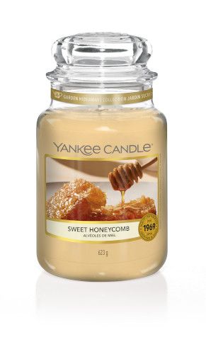 Yankee Candle Sweet Honeycomb geurkaars in een grote glazen pot. Warme honing, rechtstreeks uit de kam – een natuurlijk zoete geur met een vleugje karamel, sandelhout en vanille.